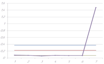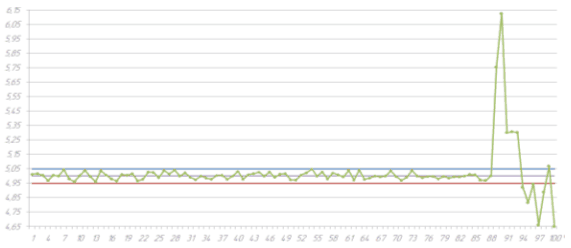 После построения 4х контрольных карт видно, что наиболее информативной контрольной картой для данной операции является X-карта средних значений, по ней видно, что до седьмой выборки технологический процесс находится в статистически устойчивом состоянии, значение же седьмой выборки тяготеет к верхней предупредительной границе, что говорит о возможной разладке технологического процесса в этой точке. Причинами разладки могут являться: использование низкокачественных ЭРЭ, а так же влияние человеческого фактора на операции №185.