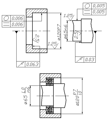 В соответствии с расчетами устанавливаем для размеров А2, А3,А4,А5,А6 – 8 квалитет точности и основные отклонения ei>1>= ei>2> = ei>3> = ei>5 >= ei>6> = 0, es>1> = +0,025 мм, es>2> = +0,033 мм, es>3> = +0,033 мм, es>5> = +0,027 мм, es>6> = +0,033 мм. Для размера А1 – 7 квалитет. Основные отклонения для размера А4 - ES>4> = 0 мм, EI>4> = -0,027 мм