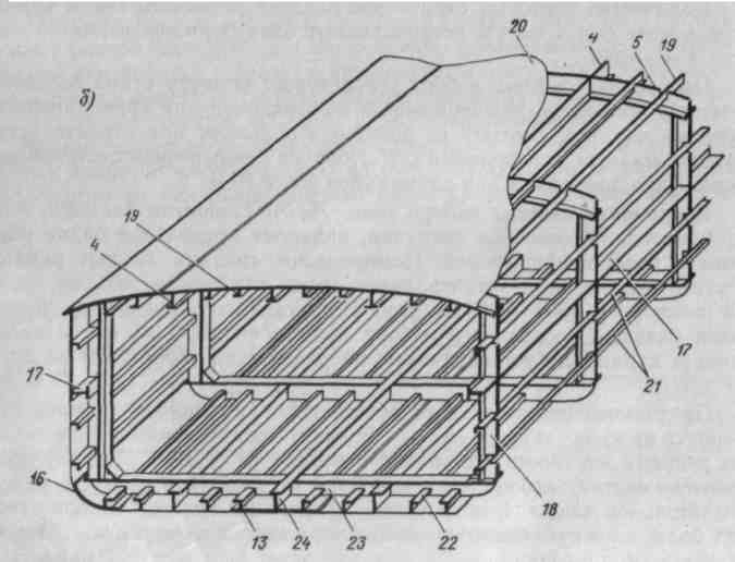 1 — ширстрек; 27— палубный и бортовой стрингеры; 3— пиллерс; 4— карлингсы; 5 — рамный бимс; в — холостые бимсы; 7— кница; 8, 9, 10 — холостой, флорный и рамный шпангоуты; // — голубницы; 12, 14, 24 — средний, бортовой и днищевый кильсоны; 13 — утолщенный килевой пояс; /5 —флор рамного днищевого шпангоута; 16 — скуловой пояс обшивки; 18, 23 — рамные шпангоуты борта и днища; 19,21 — соответственно палубные и бортовые продольные ребра жесткости; 20 — обшивка палубы; 22 — днищевые холостые продольные балки оконечности принимают не менее 1,25 толщины наружной обшивки в средней части судна, а толщину наружной обшивки в районе ахтерпика — не менее толщины наружной обшивки в средней части корпуса. Ширина ширстрека должна быть не менее 0,2Н (где Н — высота борта судна).