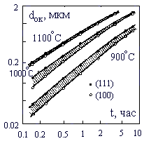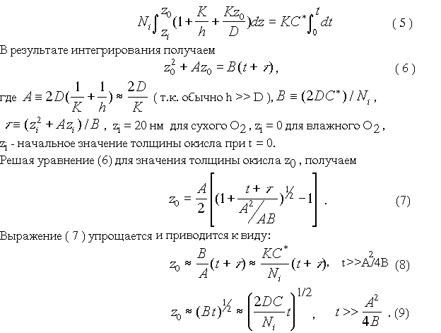 Следовательно, для малых времен окисления толщина окисла определяется постоянной скорости поверхностной реакции K и прямо пропорциональна времени окисления (8). Для больших времен окисления скорость роста зависит от постоянной диффузии D (9), а толщина окисла пропорциональна корню квадратному из времени процесса.