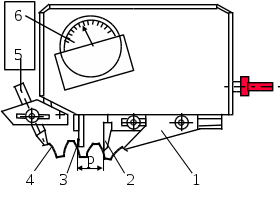 Глубиномер 3 и рамка 2 жестко связаны с зубчатой рейкой 4, передающей движение через трибку 6 стрелке 1 отсчетного устройства 5.