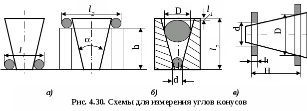 Использование роликов и шариков для измерения наружных и внутренних конусов. При известных диаметрах шариков и роликов, а также высоте h блока плоскопараллельных концевых мер измеряют размеры l1 и l2 (рис. 4.30) и рассчитывают искомый угол конуса.