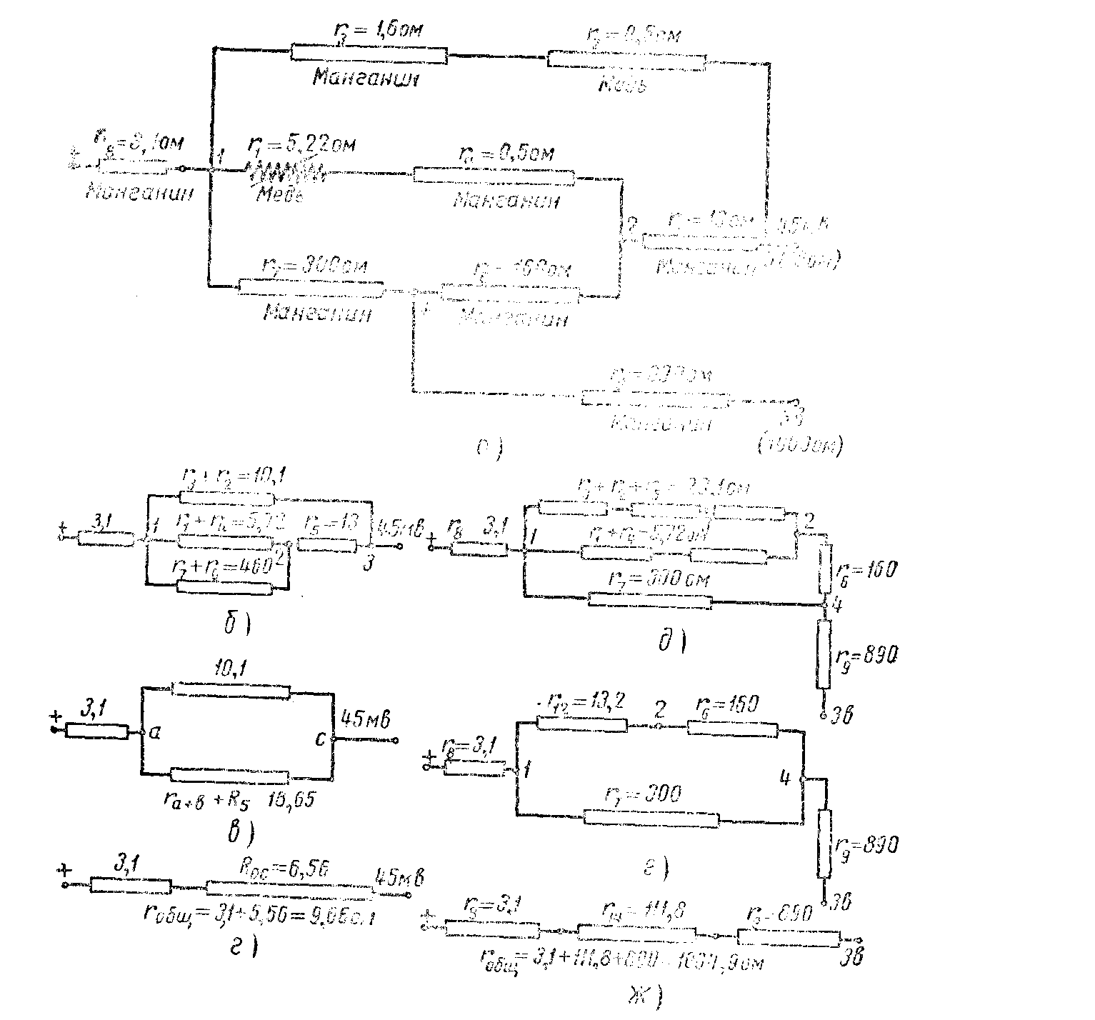 а – общая схема для пределов 45 мв и 3 в; б, в, г – преобразование сложной схемы в простую (предел 45 мв); д, е, ж – преобразование сложной схемы в простую (предел 3 в)
