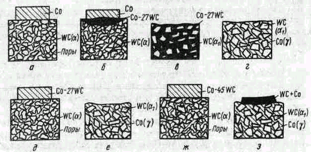 Рисунок 4 – Схема пропитки карбида вольфрама чистым кобальтом (а – г) и сплавами кобальта с карбидом вольфрама эвтектического (д, е) и заэвтектического состава (ж, з): а, д, ж – 293 -1553 К; б – 1553 К; в – 1673-1753 К; г,е.з – 293 К.