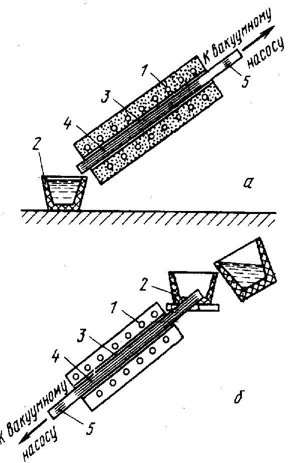 Рисунок 2 – Схема вакуумной пропитки с нижним (а) и верхним (б) расположением тигля. 1 – печь сопротивления, 2 – тигель, 3 – металлическая форма, 4 – каркас; 5 – пористая пробка.