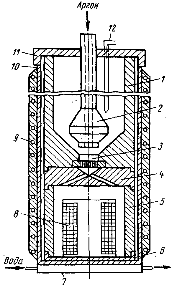 Заготовка 8 помещается в камеру 5, которая закрывается графитовой пробкой 4, на которой расположен графитовый плавильный тигель 1 с матричным сплавом. Через отверстие в запорном плунжере 2 в тигель подается инертный газ, включается нагрев, матричный материал расплавляется, после чего плунжер 2 поднимается и жидкий металл поступает в камеру 5, пропитывая пористый каркас.