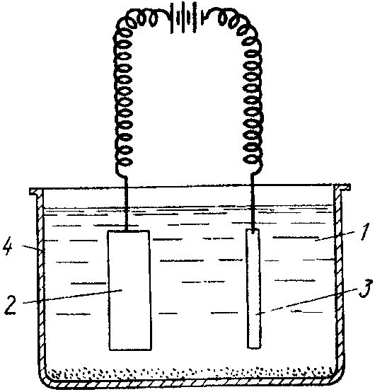 Лом карбидов металлов, в состав которого входят, например карбид WC и связующий металл, например Со, опускают в кислый электролит /, предпочтительно HN03, причем карбид выполняет роль анода 2. Катод 3 является нерастворимым; для этой цели можно использовать вольфрамовый стержень. При проведении электролиза WC растворяется, и образуется H3W04, которая осаждается на дне сосуда 4.