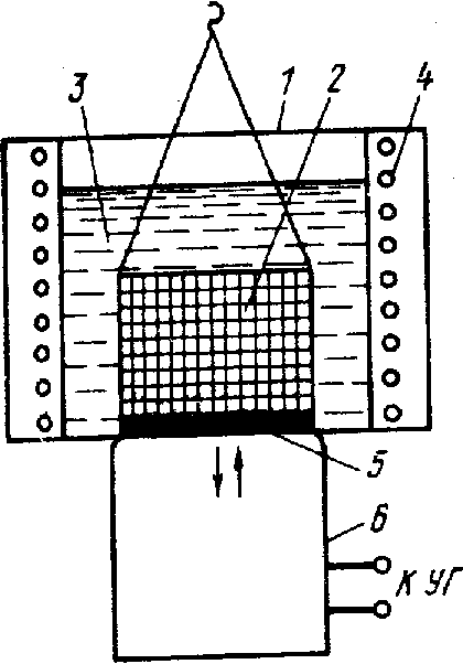 Рисунок 3 – Схема ультразвуковой пропитки: 1 – сосуд с жидкостью; 2 – пропитываемая заготовка; 3 – пропитывающая жидкость; 4 – нагреватель; 5 – мембрана; 6 – магнитостриктор.