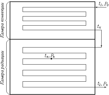 Доля тепла, передаваемого излучением в камере конвекции, значительно меньше, чем в камере радиации, как вследствие более низкой температуры газов, так и из-за меньшей толщины излучаемого газового потока. В камере конвекции эффективная толщина газового слоя предопределяется расстоянием между смежными рядами труб. Снижение температуры дымовых газов в направлении их движения, естественно, вызывает также и уменьшение передачи тепла излучением от них.
