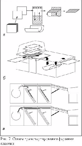Все три секции объединены системой транспортирования пластин, конструкция которой в разных моделях формовыводных устройств имеет свои особенности. Так, система транспортирования, представленная на рис.7а, передает пластины из кассеты с вертикальным их размещением в секцию экспонирования также в вертикальном положении. В секции экспонирования пластина с помощью вакуума располагается на внутренней поверхности барабана. После пробивки штифтовых отверстий и экспонирования пластина вновь принимает вертикальное положение и передается в секцию вывода. В секции вывода пластина из вертикального положения переводится в горизонтальное и выходит на приемное устройство или в подсоединенный к нему процессор.