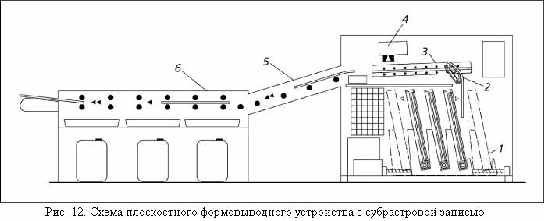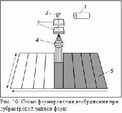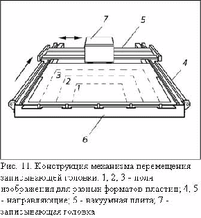 Существуют плоскостные формовыводные устройства, в которых изображение на формной пластине записывается методом субрастрового сканирования (рис.10). Для этого записывающая головка, оснащенная ND YAG-лазером 1, зеркалом 2, акустооптическим модулятором 3 и фокусирующим объективом 4, совершает непрерывное возвратно-поступательное движение по одной оси координат и стартстопное поступательное движение по другой оси. Акустооптический модулятор 3 работает в режиме акустооптического дефлектора, производя одновременно модуляцию и отклонение луча перпендикулярно возвратно-поступательному движению записывающей головки. Таким образом, за один проход головки от одного края пластины 5 до другого записывается целая полоска изображения небольшой ширины. После записи полоски на пластине, размещенной на вакуумной плите, записывающая головка перемещается на ширину этой полоски и, возвращаясь в исходное положение, записывает следующую полоску и т.д. В результате изображение на формной пластине формируется из отдельных полосок, записанных ортогональными точечно-растровыми строками небольшой длины. Конструкция механизма перемещения записывающей головки по двум координатам представлена на рис.11.