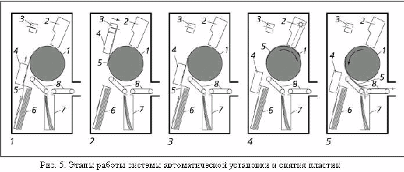 Некоторые формовыводные устройства оснащены системой автоматической установки формных пластин на внешнюю поверхность барабана и снятия их после экспонирования, а также системой пробивки штифтовых отверстий. На рис.5 показаны этапы (1-5) работы такой системы. Формная пластина 5 с помощью пневматического устройства подачи 4 вынимается из сдающей кассеты 6 и переносится к устройству пробивки штифтовых отверстий 3. Затем устройство 4 подводит край пластины с отверстиями к барабану 1 и надевает ее на штифты. При повороте барабана 1 на один оборот пластина полностью прилегает к нему и закрепляется зажимами. После этого барабан начинает вращаться, а записывающая головка 2, перемещаясь вдоль образующей барабана, экспонирует пластину. По окончании экспонирования барабан останавливается и поворачивается на один оборот назад. При этом пластина снимается со штифтов и с помощью транспортеров 8 подается в приемную кассету 7 или в процессор для обработки форм, соединенных с формовыводным устройством.
