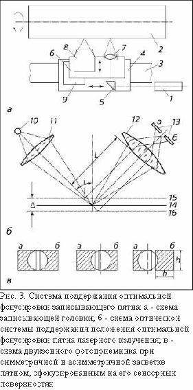На выходе фотоприемника находится устройство, которое формирует электрический сигнал, пропорциональный разности освещенностей зон а и б, который имеет либо положительный, либо отрицательный знак. После усиления мощности этот сигнал поступает на привод 9 перемещения дополнительной каретки, являющийся выходом цепи обратной связи. Перемещение дополнительной каретки 6 приводит пятно лазерного излучения в положение 14 оптимальной фокусировки. Разностный электрический сигнал становится нулевым.