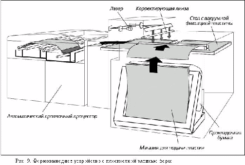 В устройстве с плоскостной записью формных пластин, соединенном в линию с проявочным процессором (рис.9) в качестве источника света использован лазерный диод с длиной волны 633 нм.