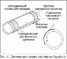 Формные пластины крепятся на внешней поверхности барабана с помощью механического, магнитного, вакуумного прижима или их комбинаций. На рис.4 представлена система крепления формных пластин, состоящая из подвижных (под разный формат пластин) зажимов в сочетании с вакуумным прижимом. Такая система надежно фиксирует пластины даже при высокой частоте вращения барабана - до 1000 об. /мин.