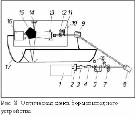 Основой лазерных формовыводных устройств является оптико-механическая система, содержащая в зависимости от конструкции один или несколько лазеров, модулятор, телескоп, фокусирующую линзу, поворотные зеркала, вращающийся зеркальный дефлектор, механизм крепления и перемещения формной пластины, механизм перемещения оптической или термической головки. [3]