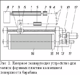 Лазерное сканирующее устройство с однолучевой записью формной пластины (рис.2) работает следующим образом. Формная пластина 16 закрепляется на барабане 15, который установлен на станине 14, и вращается электродвигателем постоянного тока 12 через механизм привода 13. На одном валу с барабаном 15 расположен оптоэлектронный преобразователь 11 угловых перемещений в цифровой код. Вдоль образующей барабана на станине установлен ходовой винт 9, на валу которого расположен шаговый электродвигатель 10. При работе шагового электродвигателя 10 ходовой винт 9 вращается, и благодаря этому каретка 7 с записывающей головкой, содержащей фокусирующую линзу 6 и зеркало 3, перемещается вдоль образующей барабана. В качестве источника излучения используется твердотельный YAG-лазер 1, работающий в ИК-диапазоне спектра на длине волны 1,064 нм с выходной мощностью 15-20 Вт и оснащенный системой охлаждения 8. Лазерный луч модулируется акустооптическим модулятором 2 и далее через систему зеркал 3, диафрагму 4, телескоп 5 попадает в линзу 6, которая фокусирует его в пятно малого размера на поверхности формной пластины, закрепленной на вращающемся барабане 15. Развертка по строке осуществляется вращением барабана и контролируется оптоэлектронным преобразователем угловых перемещений 11, а развертка по кадру - вращением (с помощью шагового электродвигателя 10) прецизионного ходового винта 9, по которому движется каретка 7 записывающей головки.