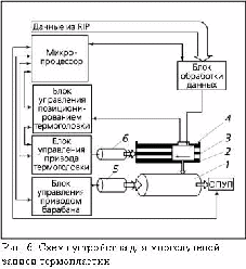 Барабан 1 и ходовой винт 3 получают вращение от электродвигателей 5 и 6, управляемых электронными блоками по командам микропроцессора. Позицию барабана (с целью синхронизации его вращения с работой светового затвора) фиксирует оптоэлектронный преобразователь угловых перемещений. [3]