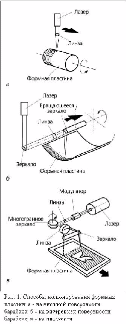 В современных системах CTP, ориентированных на изготовление офсетных и фотополимерных форм высокой и флексографской печати, применяют лазерные формовыводные устройства трех основных принципов (рис.1):
