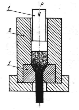 Мундштучное прессование применяют для получения заготовок изделий большой длины и равномерной плотности (прутки, трубы, уголки и т. п.) из труднопрессуемых порошков вольфрама, тория, бериллия и др. Процесс получения заготовок заключается в выдавливании порошка, заключенного в полость контейнера 2 (рис. 4), пуансоном 1 через отверстие мундштука матрицы 3. Для обеспечения лучшего связывания частиц порошка и более легкого истечения смеси, через отверстие мундштука в шихту добавляют пластификатор (крахмал, парафин и т. д.). Массовая доля пластификатора в шихте обычно составляет 10... 12 %.