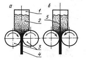 При прокатке в вертикальном направлении (рис. 5, а) порошок 2 непрерывно поступает из бункера / в зазор между валками 3. При вращении валков порошок обжимается и вытягивается в ленту или полосу 4 определенной толщины. Применение бункера с одной (рис. 5, б) или несколькими перегородками 5 позволяет получать двух- или многослойные заготовки из различных материалов.