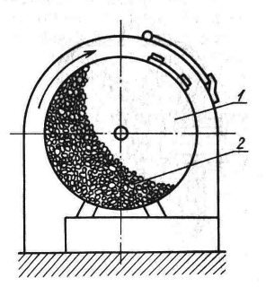 Шаровая мельница (рис. 1) состоит из стального барабана 1, в который загружаются размалывающие шары (стальные, чугунные или изготовленные из твердых сплавов) и обрабатываемый материал 2. Коэффициент заполнения барабана шихтой и шарами составляет 0,4...0,5. При вращении барабана шары поднимаются в направлении этого вращения, а затем падают или скатываются вниз и дробят материал. Для облегчения размола его производят при низких температурах с введением поверхностно-активных веществ, создающих расклинивающие усилия в микротрещинах частиц. Частицы порошка, полученные размолом, имеют вид неправильных многогранников, листочков или завитков размером 0,1...3 мм.