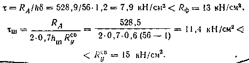 Пo требуемым расчетным длинам швов с учетом конструктивных требований (добавка 1 см длины шва на непровар и зазоры между швами) намечаем графически (по масштабу) конфигурацию и размеры опорной фасонки. Проверяем опорную фасонку на срез, а также швы ее крепления к торцовому листу (толщину швов назначаем 6 мм):