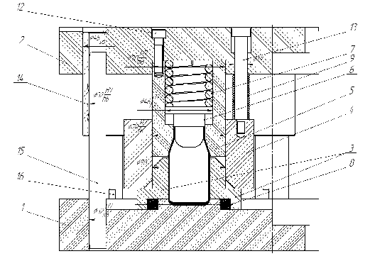 В данном штампе колпачок устанавливается в отверстие прижима, затем происходит ход пресса и деформация колпачка при прохождении через 2 матрицы. После прохождения второй матрицы полуфабрикат распружинивается и при обратном ходе пуансона снимается с него и падает в отверстие подштамповой плиты.