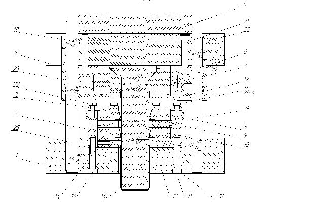 В данном штампе заготовка вырубается пуансон-матрицей из подаваемой полосы, а затем вытягивается колпачок, при обратном ходе пресса полуфабрикат выталкивается из пуансон-матрицы выталкивателем от ползуна пресса плоскость матрицы.