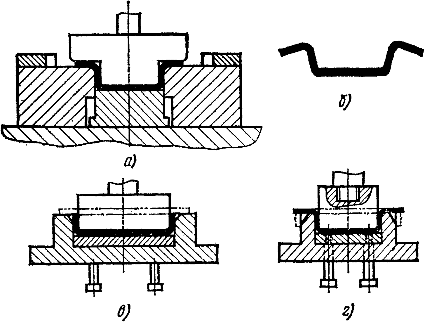 Четырехугловую гибку деталей можно выполнять в штампе, обеспечивающем изгиб четырех углов одновременно (рис. 4, а). Однако при этом, ввиду повышенного растяжения металла из-за его защемления между пуансоном и матрицей, деталь получается со значительным искривлением полок (рис. 4, б). Для исключения таких искривлений гибку следует выполнять за два перехода в одном или двух штампах (рис. 4, в и г). Однако экономичнее использовать один штамп.