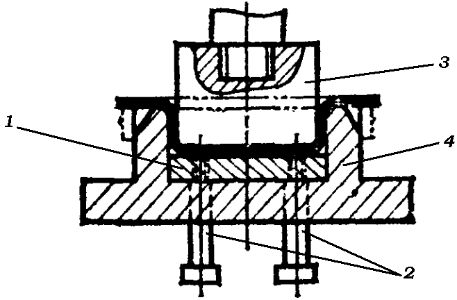 Двухугловой гибочный штамп показан на рис. 5. С его помощью будет выполняться четырехугловая гибка детали. Заготовку укладывают на прижим 1, действующий от выталкивателя 2. При опускании пуансона 3 заготовка сначала зажимается между пуансоном и выталкивателем, а затем изгибается с помощью матрицы 4 и принимает форму скобы. Затем деталь переворачивают загнутыми углами вниз и выполняется второй переход.