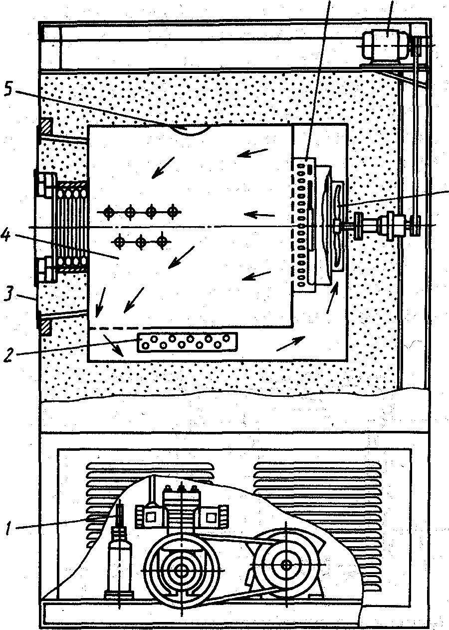 Для охлаждения небольшого числа отдельных деталей, например, режущего инструмента, калибров и других изделий из высоколегированной стали применяют камеры полезным объемом 0,1—1,0м3. Камера шкафная (КТХ) оборудована компрессорной установкой, обеспечивающей охлаждение до —100°С, и электронагревателями, позволяющими нагревать камеру до 155°С. На рис.2 показан разрез камеры КТХ. Машинное отделение расположено в нижней части камеры. Электрические нагреватели расположены под рабочим пространством камеры. Крыльчатка вентилятора, вращаемая электродвигателем, направляет поток воздуха в воздухоохладитель, в котором размещён змеевик, последовательно соединённый со змеевиком испарителя, припаянным к поверхности внутреннего корпуса камеры. Через окно в двери можно при включенном осветительном приборе осматривать внутреннее пространство камеры.6