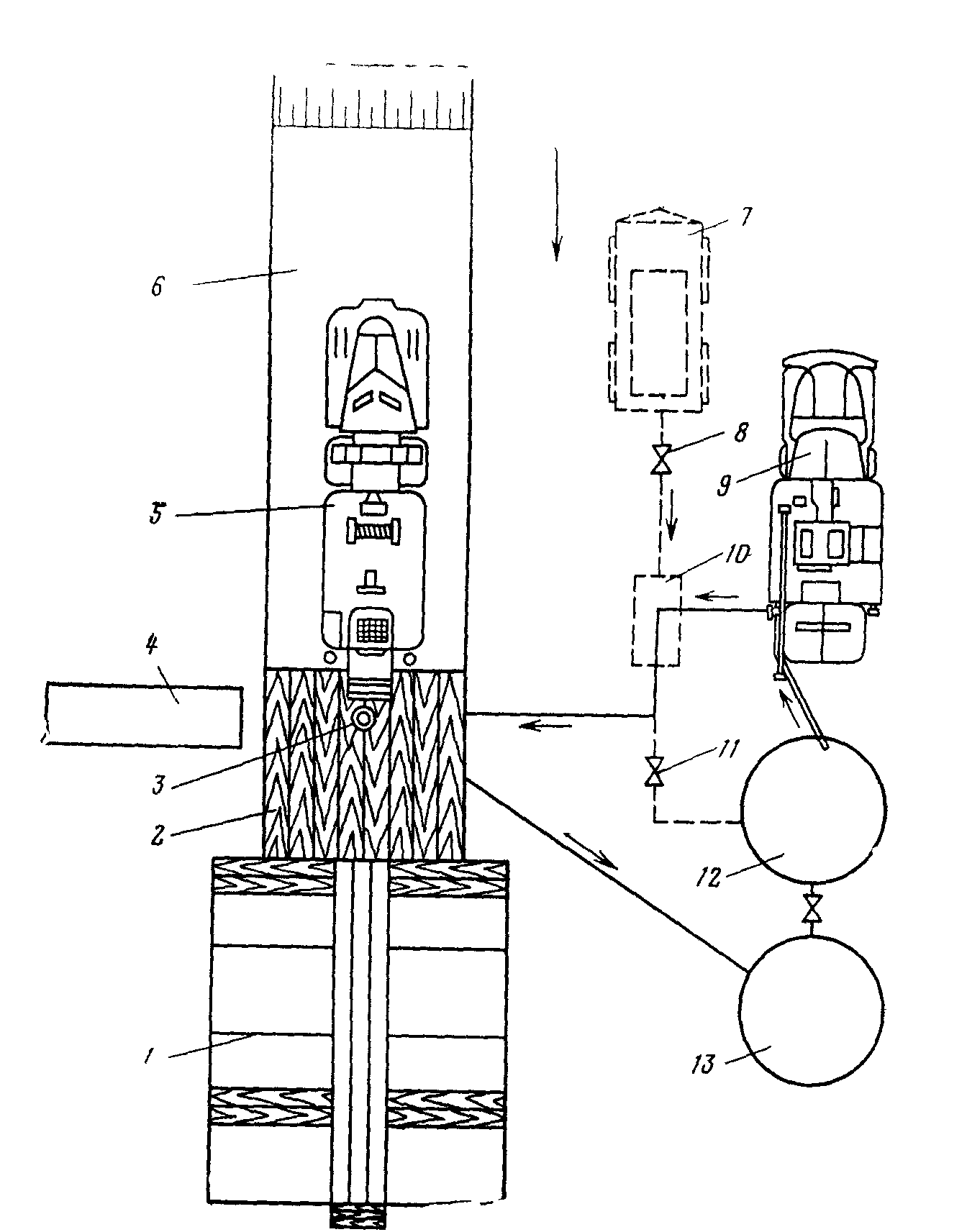 1 — мостки-стеллажи; 2 — рабочая площадка; 3 — устье скважины; 4 — балансирный ставок-качалка; 5 — подъемная лебедка (агрегат подземного ремонта); 6 — площадка для агрегата; 7 — компрессор; 8— вентиль регулировочный, 9 — установка насосная; 10 — аэратор; 11 — вентиль; 12, 13 —емкость