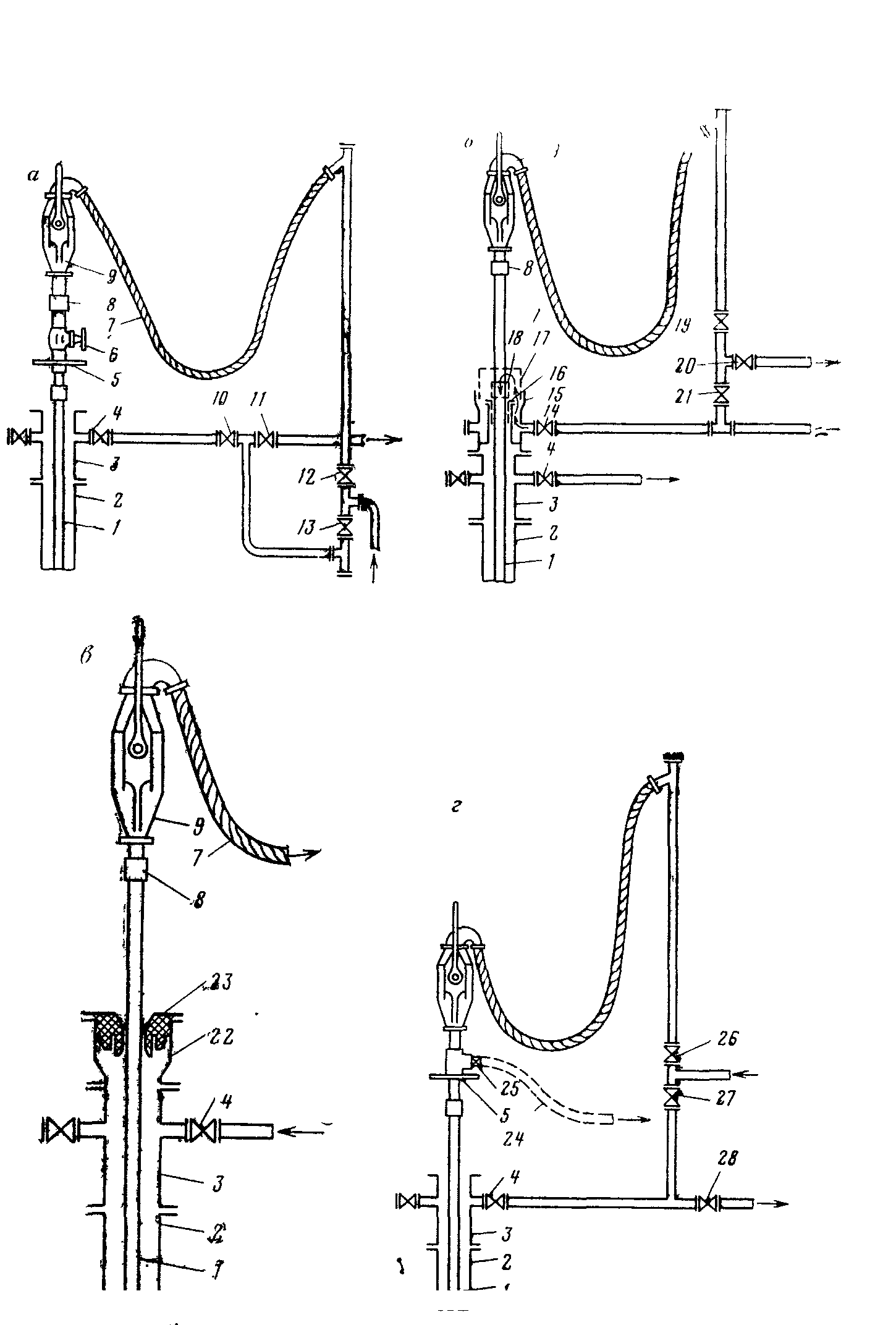 а - прямой, б — ускоренной, в — обратной, г — комбинированной, 1 — колонна промывочных труб, 2 — эксплуатационная колонна; 3 — крестовина; 4 — задвижка; 5 — фланец; б - предохранительная задвижка; 7 — промывочный шланг; 8 — муфта; 9 — вертлюг; 10, 11, 12, 13, 14 — краны, 15 — промывочная головка; 16 — вкладыш, 17 — крышка; 18 — муфта; 19, 20, 21 — краны, 22 — промывочная головка; 23 — манжетное уплотнение; 24 — гибкий шланг, 25 — пробка; 26, 27, 28 — краны