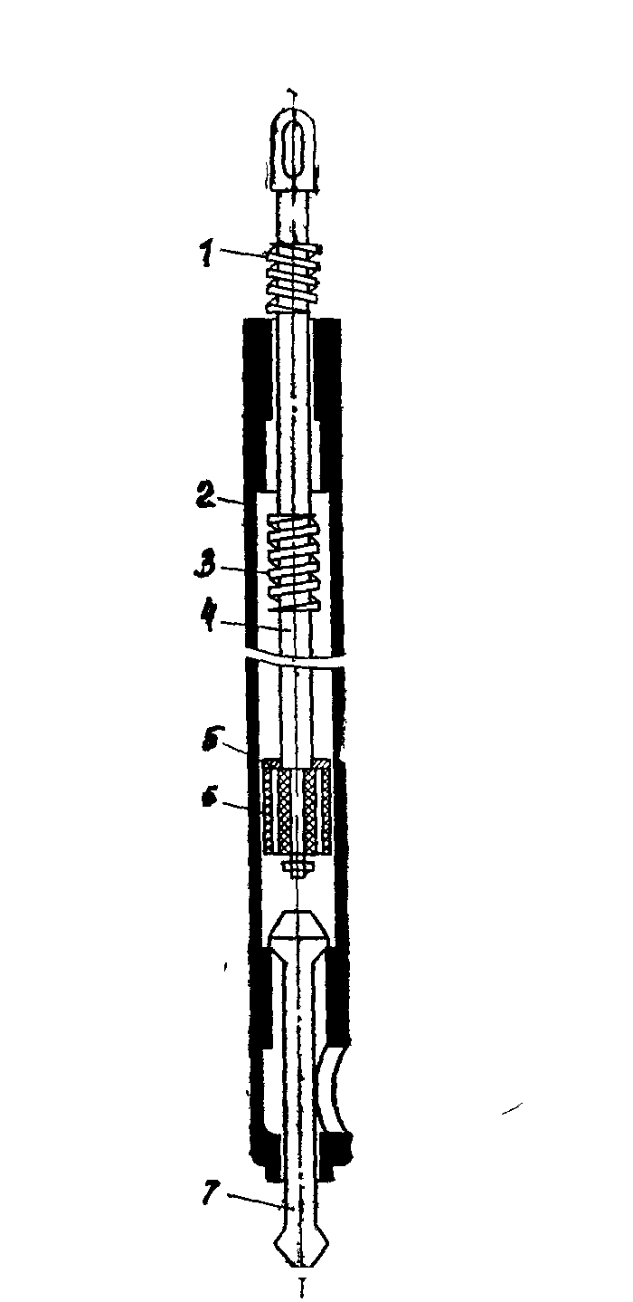 Рисунок 1. Поршневая желонка: 1, 3 - пружина, 2 - корпус, 4 - шток, 5 - шайба эластичная, 6 – поршень, 7 – клапан |