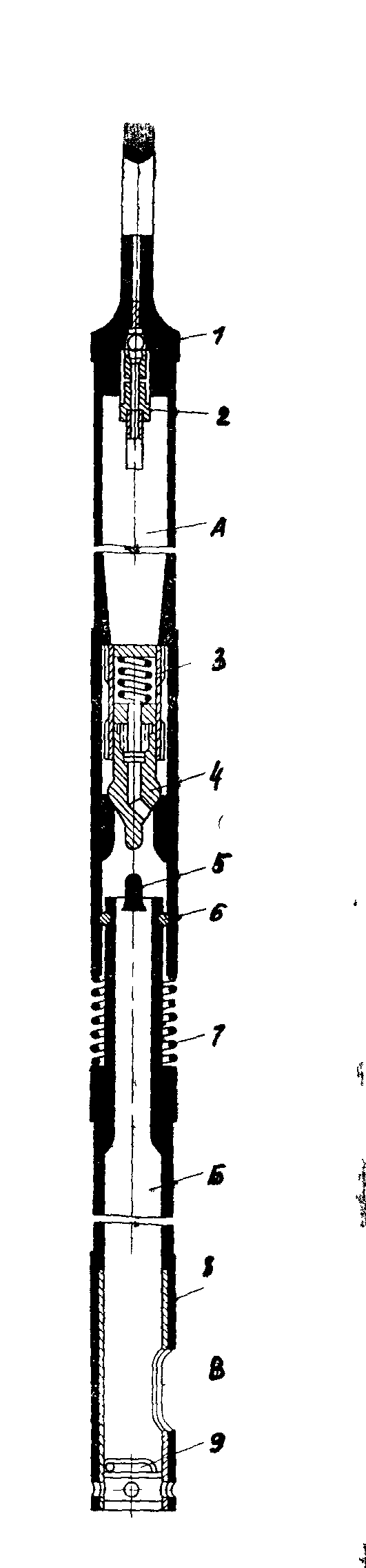 Рисунок 2. Автоматическая желонка: 1 — головка, 2 — шариковый клапан, 3 — стакан, 4 — конусный клапан, 5 — ударник; 6 — шариковый фиксатор; 7 —пру жива; 8 — заслонка; 9 — приемный клапан, А — воздушная камера, Б — песочная камера, В — выпускное отверстие |