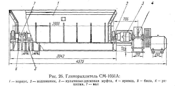Стационарный глинорыхлитель СМ-1031А одно-вальный, состоит из корпуса, вала с билами и привода (рис. 26). Корпус 1 имеет вид удлиненного бункера, внизу которого установлена решетка 6; между ее прутьями проходят била 5. Вал 7 расположен в подшипниках 2 на торцовых стенках корпуса. Вал 7 приводится в движение от электродвигателя через клиноременную передачу, цилиндрический редуктор и кулачково-дисковую муфту 3.