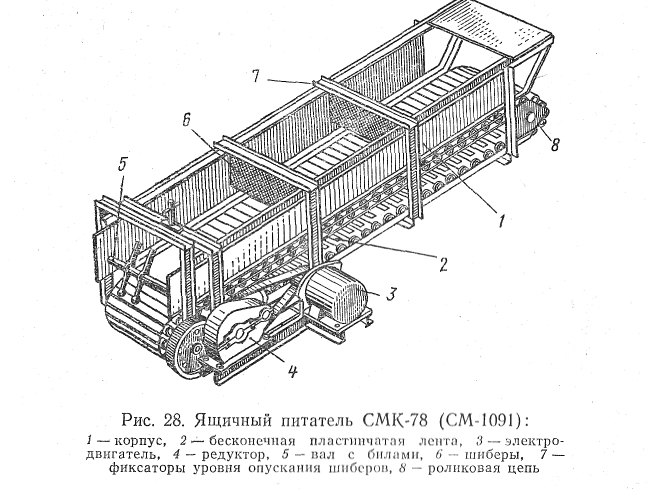 Ящичный питатель СМК-78 (СМ-1091) (рис. 28) представляет собой корпус 1, дном которого является металлическая бесконечная пластинчатая лента 2, укрепленная на двух роликовых цепях 8 и приводимая в движение через редуктор 4 электродвигателя 3. Эта лента, перемещаясь в сторону открытой части питателя, транспортирует материал к валу 5 с билами, где крупные комья частично разбиваются. К корпусу подавателя прикреплены планки, которые являются фиксаторами 7 уровня опускания шиберов. К планкам крепят металлические шиберы 6.