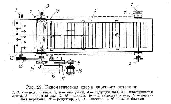 Ящичный питатель работает по следующей кинематической схеме (рис. 29). Электродвигатель 10 через шкив 9, ременную передачу 11, редуктор 12, шестерни 13 и 14 приводит в движение ведущий вал 4 с установленными на нем звездочками 2. При вращении ведущего вала приводится в движение лента. Через вторую пару звездочек цепью ленты 5 получает вращение ведомый вал 8.
