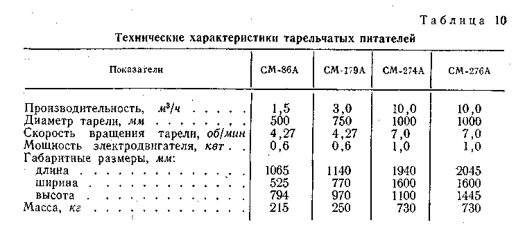 Данные о тарельчатых питателях приведены в табл. 10.