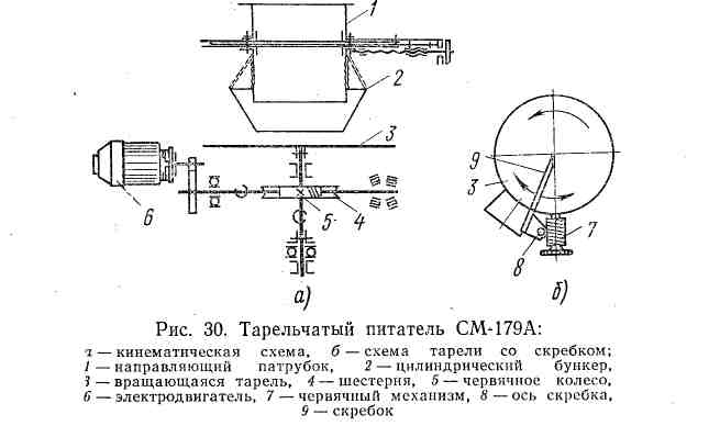 Тарельчатый питатель СМ-179А (рис. 30) состоит из направляющего патрубка , бункера, 2, вращающейся тарели 3, шеетерни 4, червячного колеса 5, приводимого в движение от электродвигателя 6.