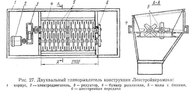 Стационарный двухвальный глинорыхлитель конструкции Ленстройкерамики (рис. 27) состоит из бункера 4, рыхлительных валов 5 с билами, шестеренной передачи 6, редуктора 3 и электродвигателя 2. Глинорыхлитель устанавливают над корпусом ящичного питателя.