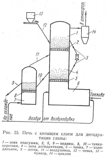 Технологическая схема получения дегидратированной глины в печах с кипящим слоем принцилиально такая же, как и в барабанных печах. Особенность заключается в том, что при дегидратации в печах с кипящим слоем глина предварительно должна быть гранулирована на куски одинаковьх размеров (диаметром 10—12 мм или несколько менее): 1