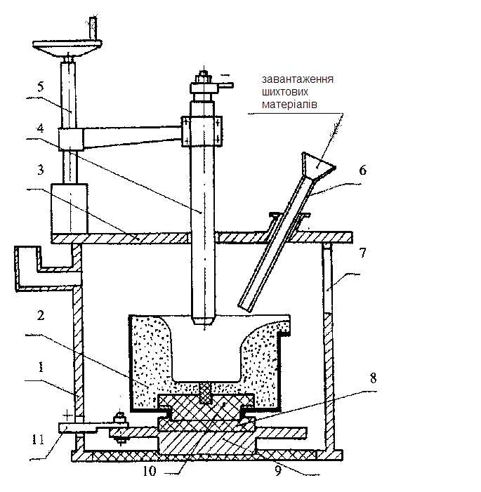 Конструкция печи включает корпус 1, плавильный тигель из огнеупорной футерівки 2, крышку 3, дуговой плазмотрон 4, механизм перемещения плазмотрона 5, устройство для загрузки шихты в плавильный тигель 6, обзорное окно 7, струмопровід 8, что состоит из металлической плиты 9, графитовой плиты 10 и медной шины 11. Плавильный тигель розміщався внутри плавильной камеры. Устройство для загрузки шихты было выполнено в виде керамической трубы с лейкой, размещенной на крышке печи. Подовим электродом служил графитовый стержень, вмонтированный в футеровці поду печи.