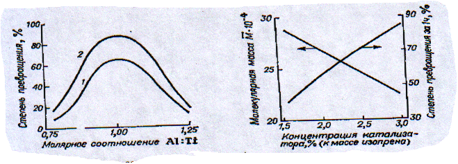 При избытке триизобутилалюминия происходит более глубокое восстановление Ti4+ (до Ti2+ и даже до элементарного Ti), что приводит к замедлению полимеризации и образованию низкомолекулярных продуктов. При избытке тетрахлорида титана образуются алкилалюминийдихлориды, вызывающие резкое снижение содержания 1,4-цис-звеньев в полимере и вторичные реакции в полимерных цепях (циклизацию, изомеризацию, сшивание). В результате получаются жесткие, малоэластичные продукты.