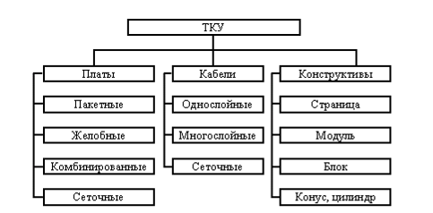 Функционально ТКУ подразделяются на четыре группы: конструктивы, платы, кабели и соединители (рис. 7). Каждая структура может быть одно- или многослойной с двухкоординатным, внутримодульным, внутриблочным или межблочным расположением нитей. Особенности технологии позволяют получать как гибкие и эластичные, так и жесткие коммутационные устройства плоской или объемной формы.