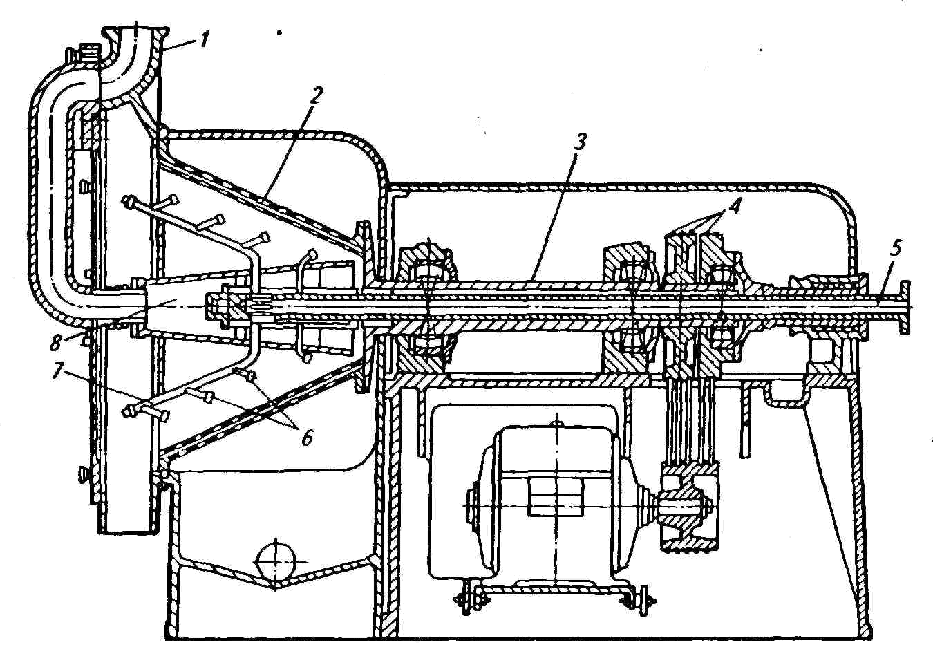 Кашка подается через трубу 1 и питатель 8 в вершину ситового конуса. Барабан вращается с частотой 900 с-1. Под действием центробежной силы кашка равномерно распределяется по внутренней поверхности барабана и продвигается к большему его основанию. Навстречу движению кашки подается вода или жидкое крахмальное молоко через вал 5, который вращается внутри вала 3. Струйный ротор-ороситель состоит из коллектора 7 и разбрызгивающих сопел 6. Привод 4 обеспечивает опережение вращения ротора-оросителя на 50 с-1 по сравнению с частотой вращения барабана 2. Вода под давлением 0,2...0,25 МПа образует против движения кашки водяной шнек, задерживающий ее продвижение по ситу и способствующий отмыванию свободного крахмала.