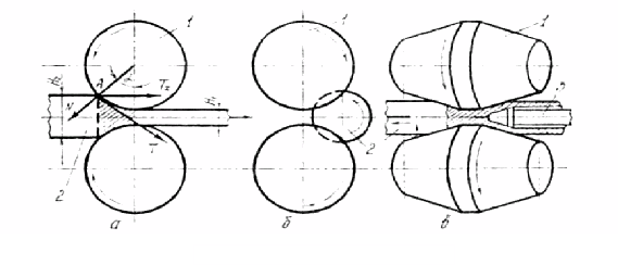 Є три основні схеми цього процесу - прокатування поздовжнє, поперечне і поперечно-гвинтове (рис.6).