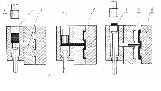 За схемами пресування буває пряме і зворотне. При прямому (рис. 12а) заготовка 3 і пуансон 1 рухаються в один бік. Частина заготовки залишається в контейнері 2 (це прес-залишок). Маса його становить 8-12% від маси заготовки. При зворотному пресуванні (рис. 12 б) матриця 4 встановлюється на кінці пустотного пуансона 1. Матриця переміщується разом з пуансоном а метал заготовки витискається їй назустріч, тобто в напрямі, зворотному до руху пуансона. При зворотному пресуванні буває менше відходів (залишок становить 6-10%), воно потребує менших зусиль.