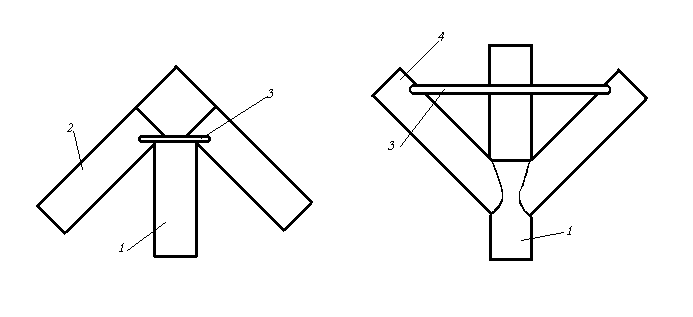 В нижній частині стропильні ноги опираються на мауерлат (підстропильний брус), а верхній в коньковий прогін, який в свою чергу спирається на стійки, які встановлюються на нижній прогін. З’єднують елементи стропил на врубках, і кріплять скобами та хомутами.